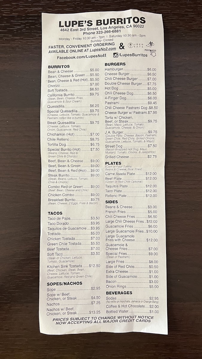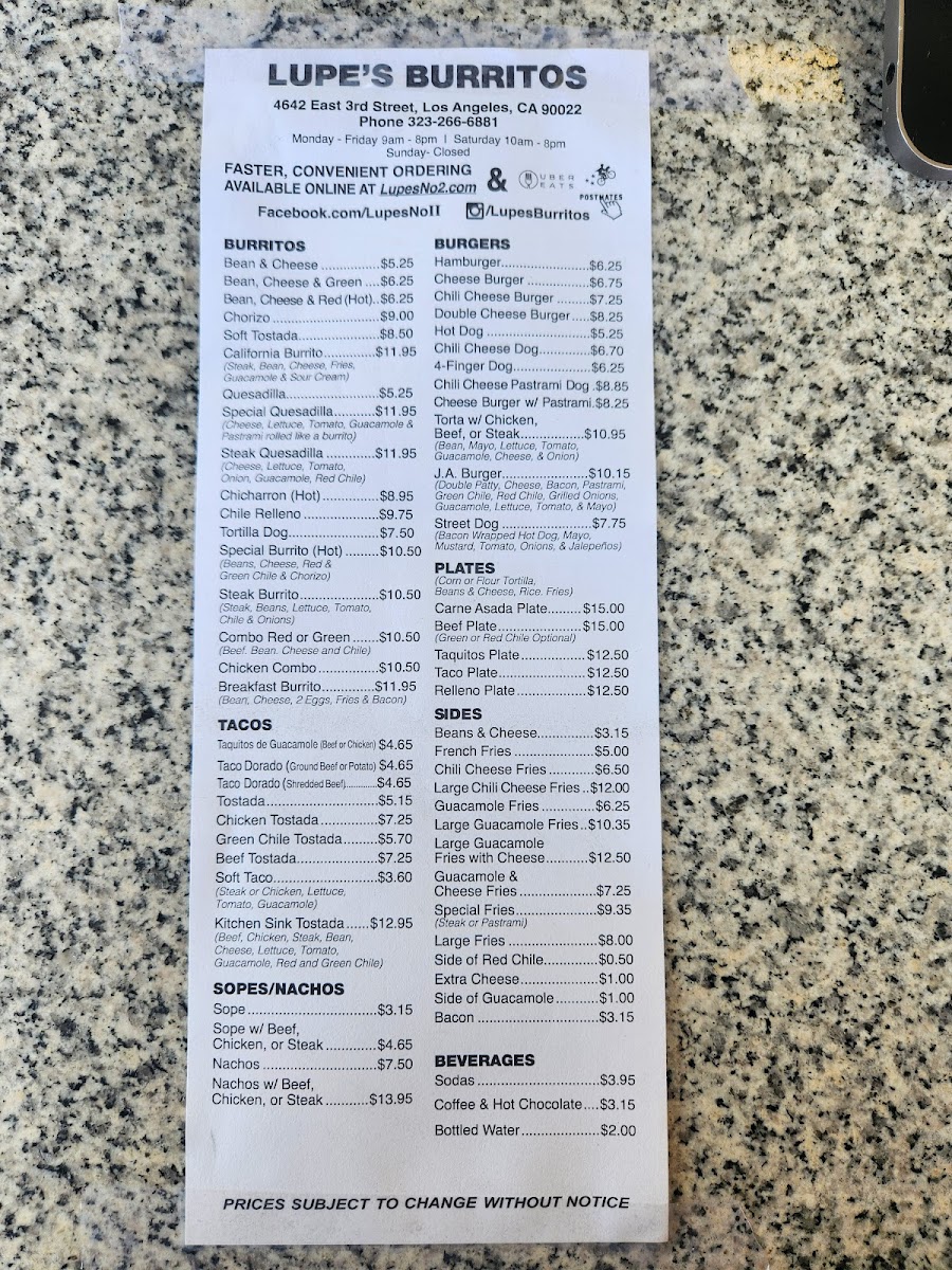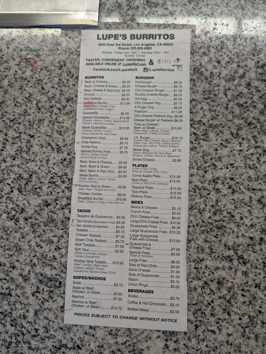 If you’re in the mood for some mouthwatering Mexican cuisine, look no further than Lupe's Burritos, located at 4642 E 3rd St, Los Angeles, CA 90022. This charming gem offers a delightful mix of satisfying comfort food that will surely tickle your taste buds.